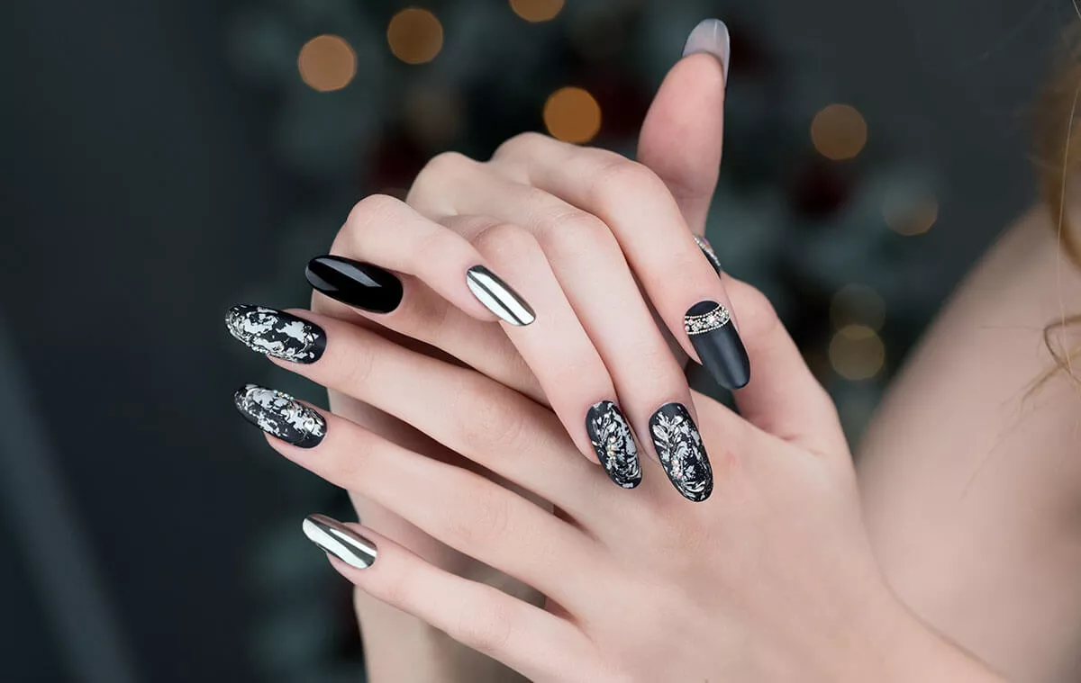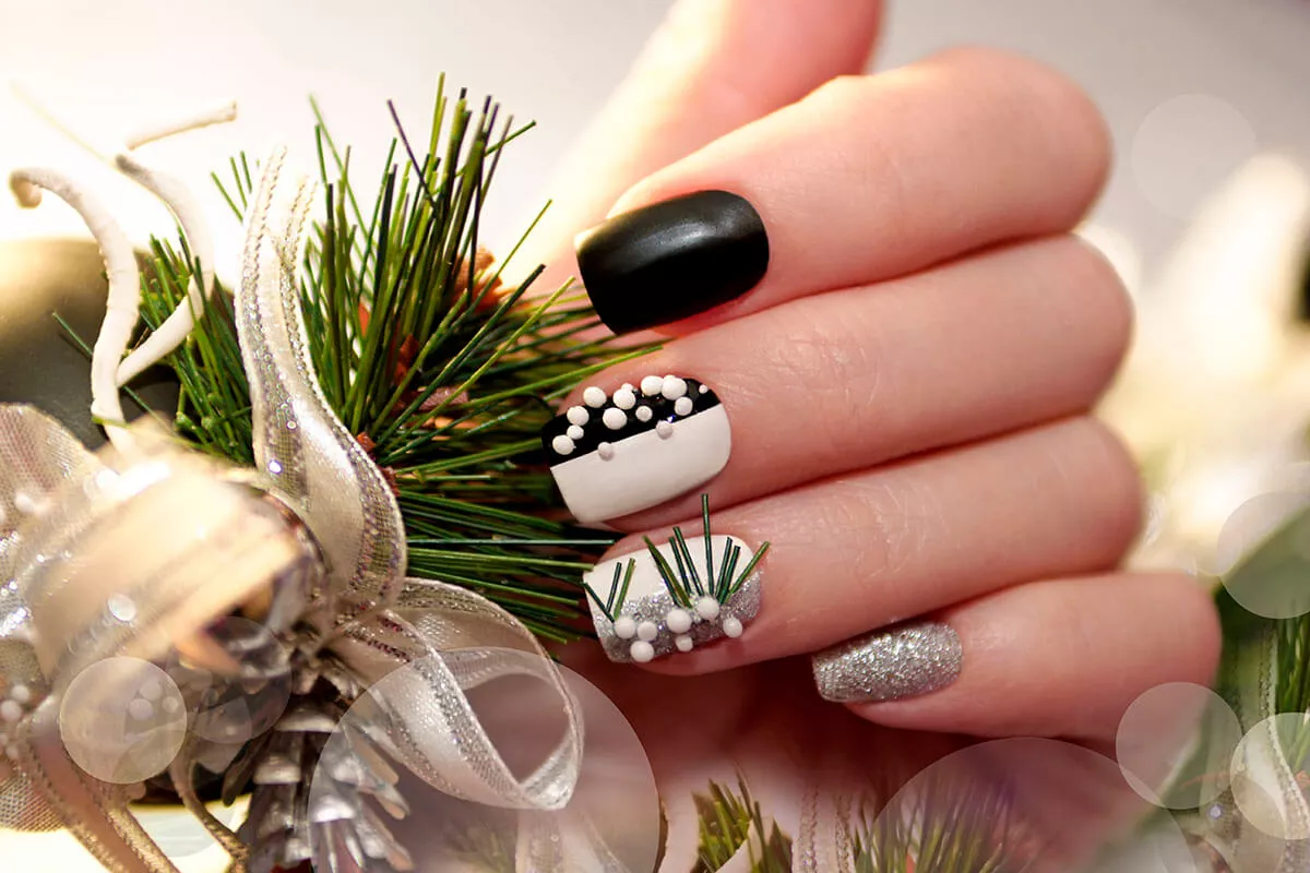 Чтобы угодить символу года, маникюр можно выполнить в чёрном цвете с добавлением серебристого или белого декора.