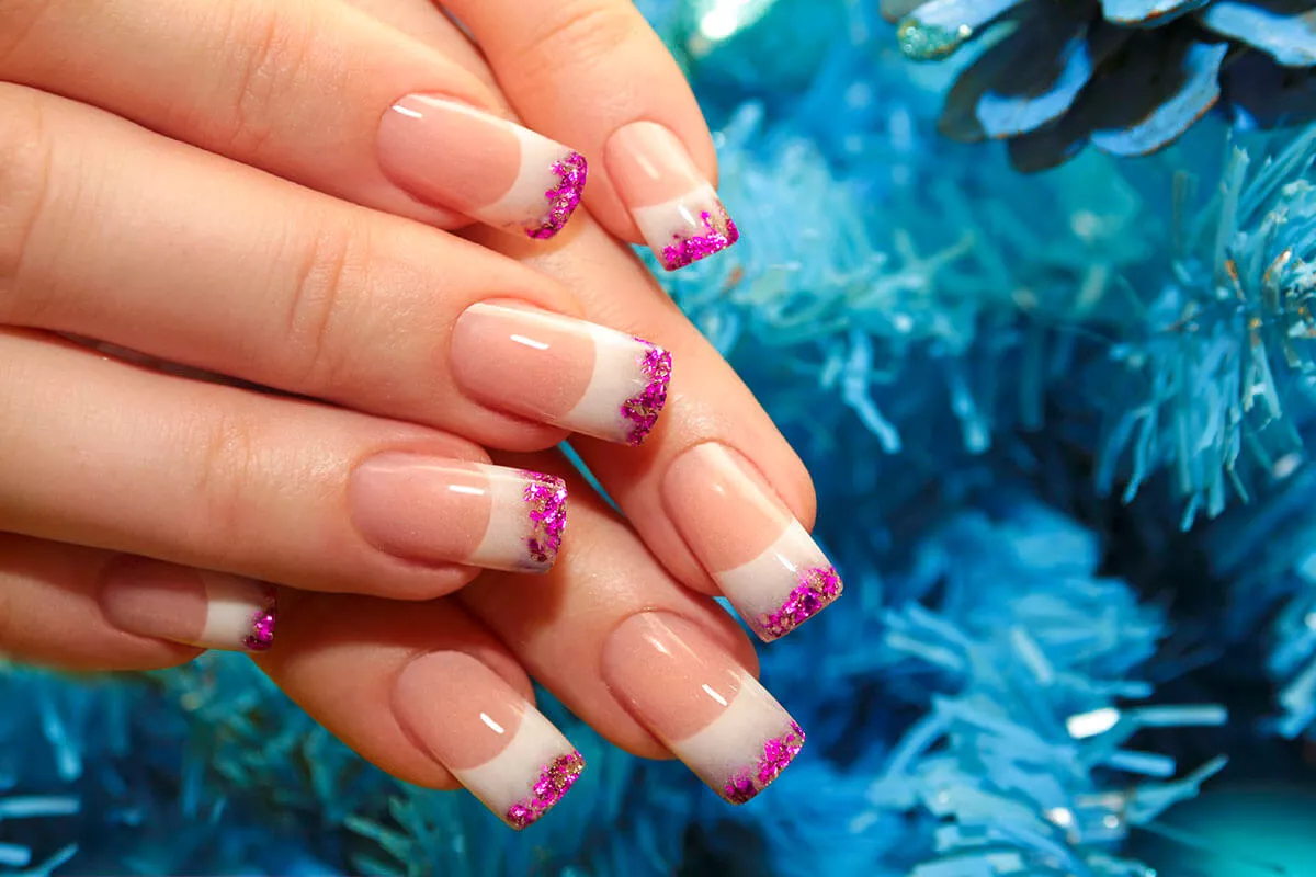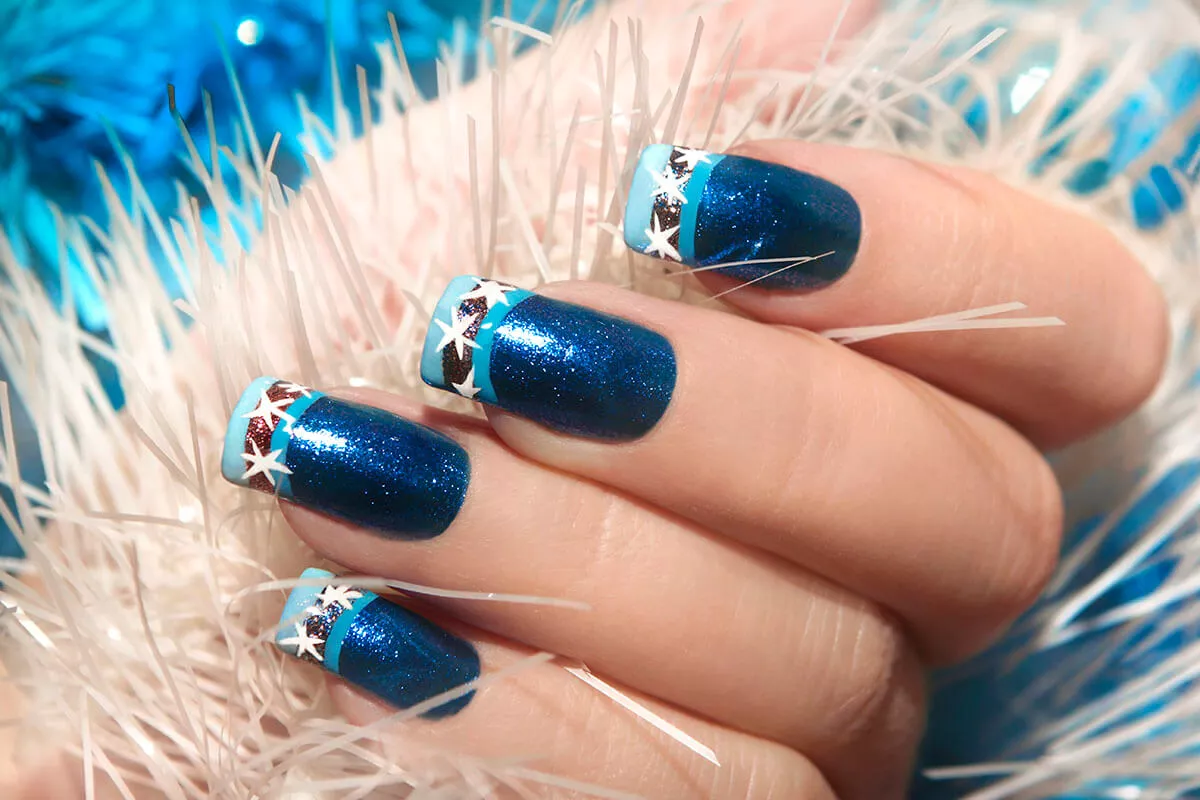 Новогодний френч можно выполнить как в классическом, так и в праздничном варианте, оформив его гель-лаком с шиммером (с блёстками) или аквариумным дизайном.